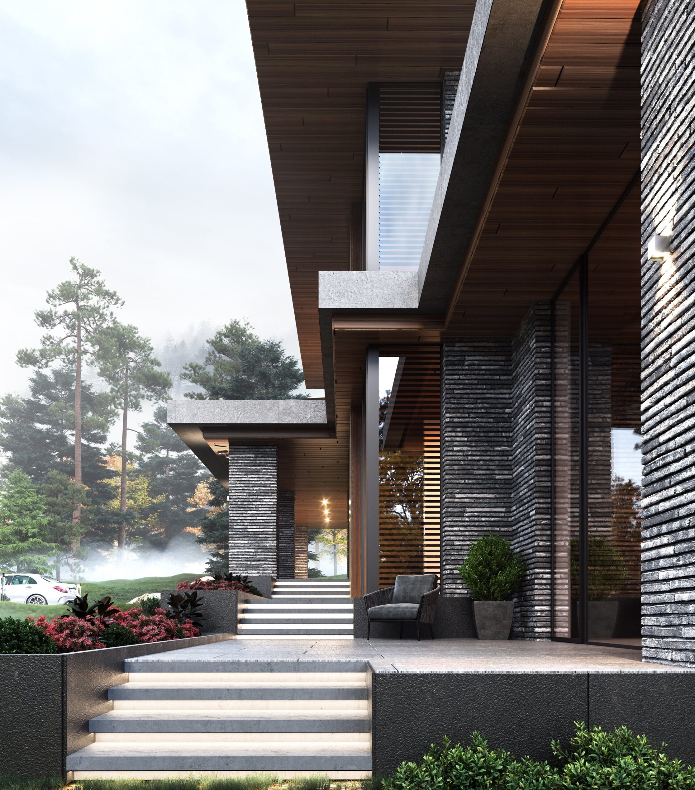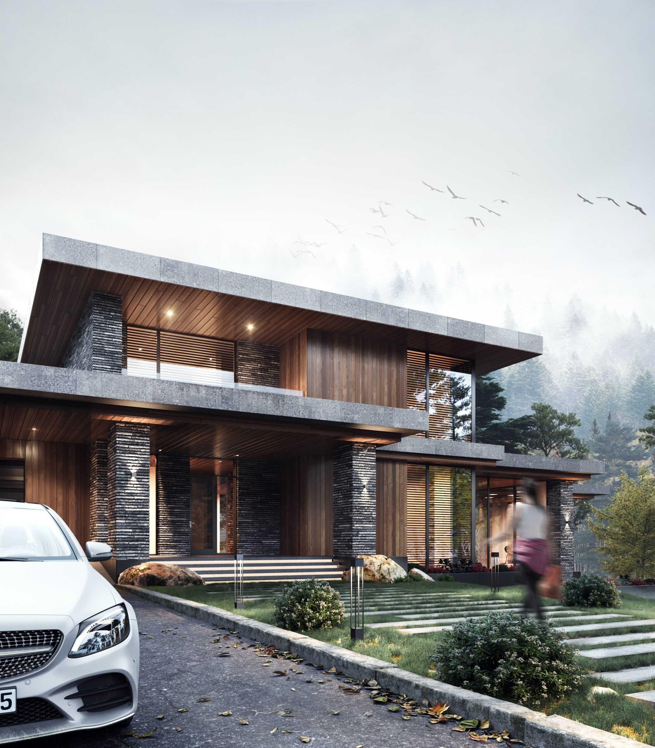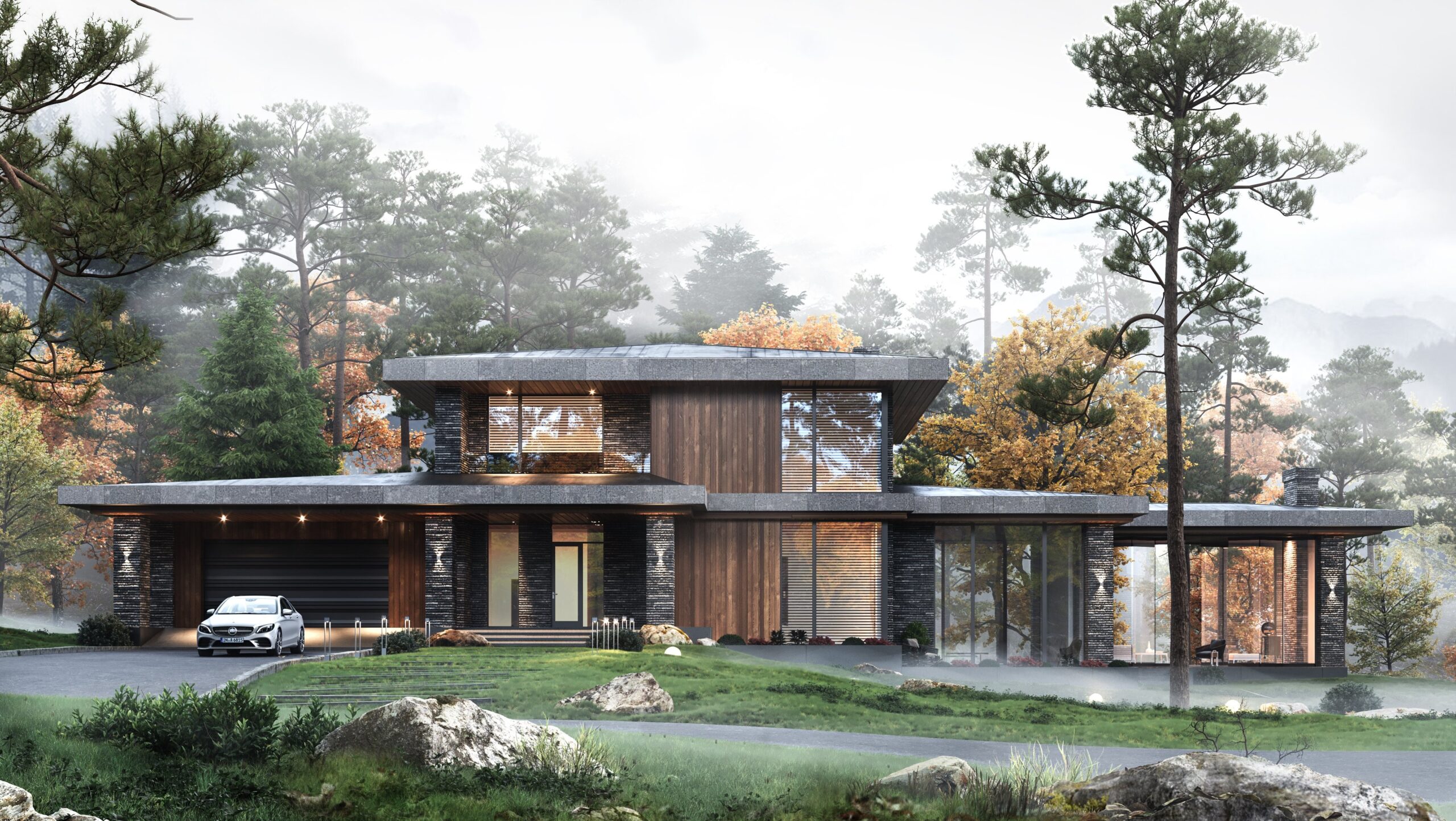 Geniş yatay düzlemleri ve şeffaf cepheleri sayesinde, dışarıdaki orman dokusu evin bir parçası haline gelir.